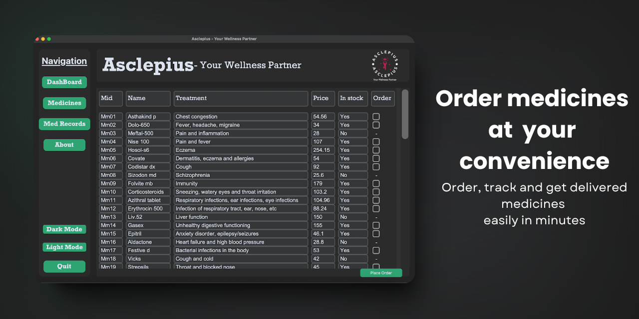 A desktop application developed in Python and Custom Tkinter to view and request medicines from the Wellness center, check medicine availability, and order medicines directly.